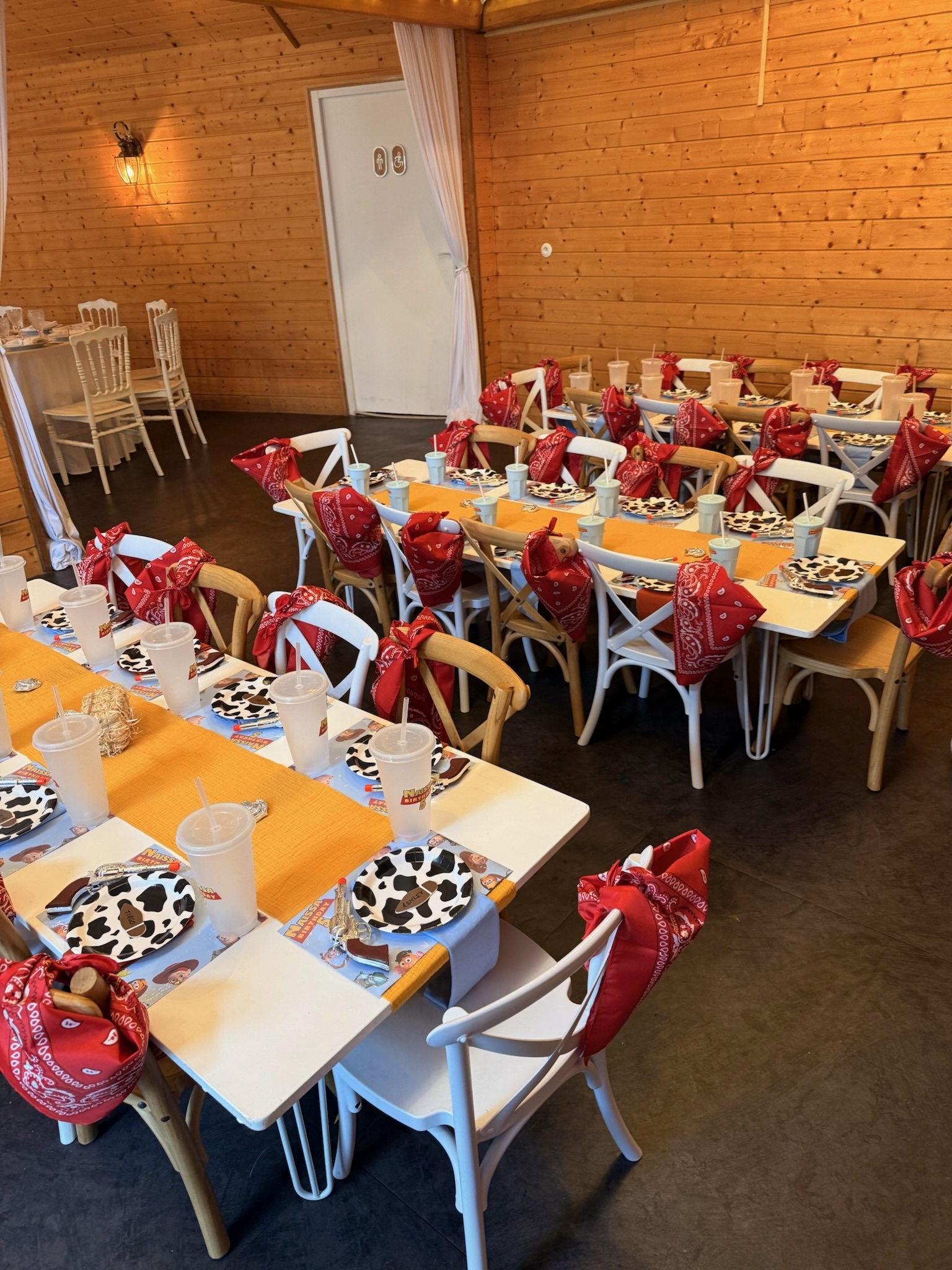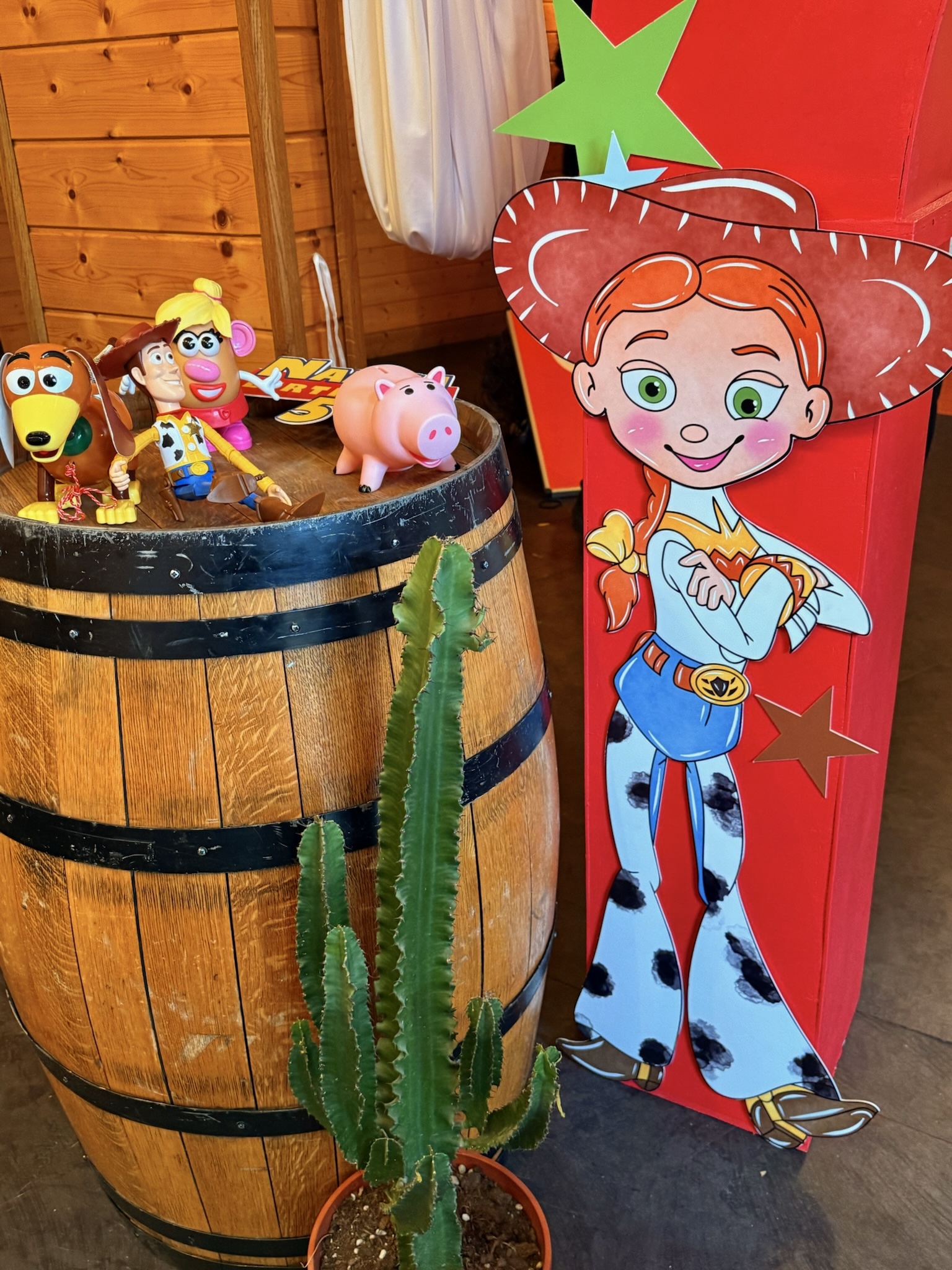 La décoration anniversaire fille 5 ans thème Toy Story est enrichie par des éléments immersifs : figurines XXL, tonneaux décoratifs, accessoires western, mise en lumière chaleureuse et détails personnalisés. Chaque espace est pensé pour une organisation anniversaire enfant clé en main.