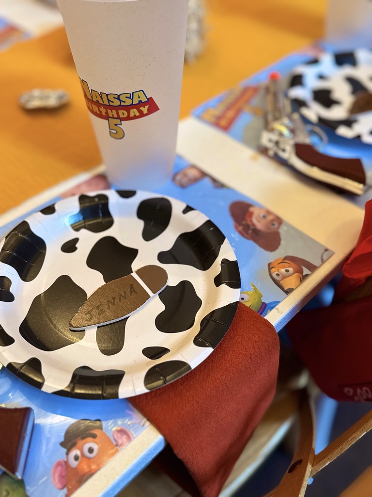 La table anniversaire Toy Story personnalisée prolonge l’univers avec vaisselle thématique, bandanas façon cow-boy, sets de table assortis et boîtes cadeaux personnalisées. Les invités découvrent un espace festif, coloré et parfaitement coordonné.