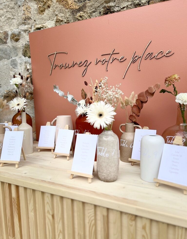 Lors de ce mariage unique, nous avons imaginé une décoration élégante et chaleureuse, parfaitement adaptée à l’ambiance naturelle et intime du couple. L’événement, célébré avec 100 invités, s’est déroulé dans une salle principale décorée avec soin, où chaque détail a été pensé pour créer une atmosphère chic et accueillante. La salle a été sublimée par des éléments en bois brut, avec des chaises et tables en bois massives, ajoutant une touche rustique et authentique à l’ensemble. Les touches subtiles de terracotta, à travers des accessoires, des vases et des éléments de décoration, ont apporté de la chaleur et de la modernité à l’espace. Ces couleurs chaudes s’harmonisaient parfaitement avec les compositions de fleurs fraîches et de pampa, qui ont enrichi la décoration avec leurs nuances douces et leur légèreté naturelle. Un photocall élégant, décoré avec des éléments floraux et naturels, a été installé pour permettre aux invités de se prendre en photo et immortaliser leurs souvenirs. Ce coin photo, conçu dans un style bohème et raffiné, a été un lieu très prisé durant la soirée, ajoutant une touche ludique et mémorable à l’événement. Le plan de table a été conçu de manière originale et créative, avec une disposition qui mêlait élégance et praticité.